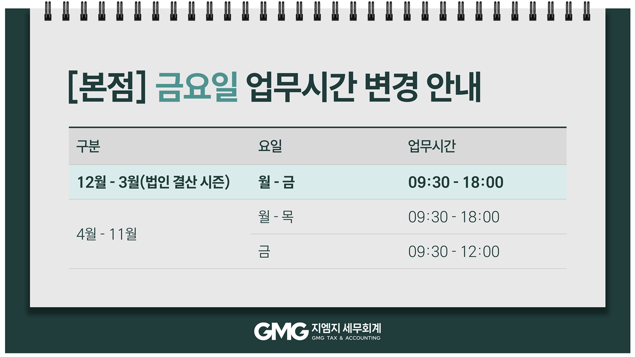 법인 결산 시즌(12월 - 3월) 중 원활한 업무 소통을 위해 금요일 업무시간이 기존 오전근무에서 풀타임으로 변경됩니다.